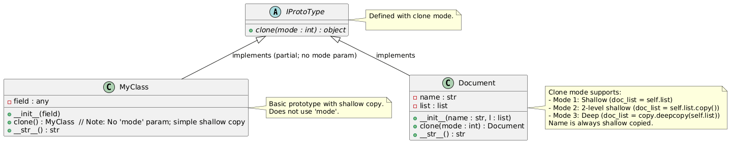 - Both MyClass and Document classes define the possible objects that can be created to implement the “IPrototype” interface (which is shown in the diagram as “IProtoType”.