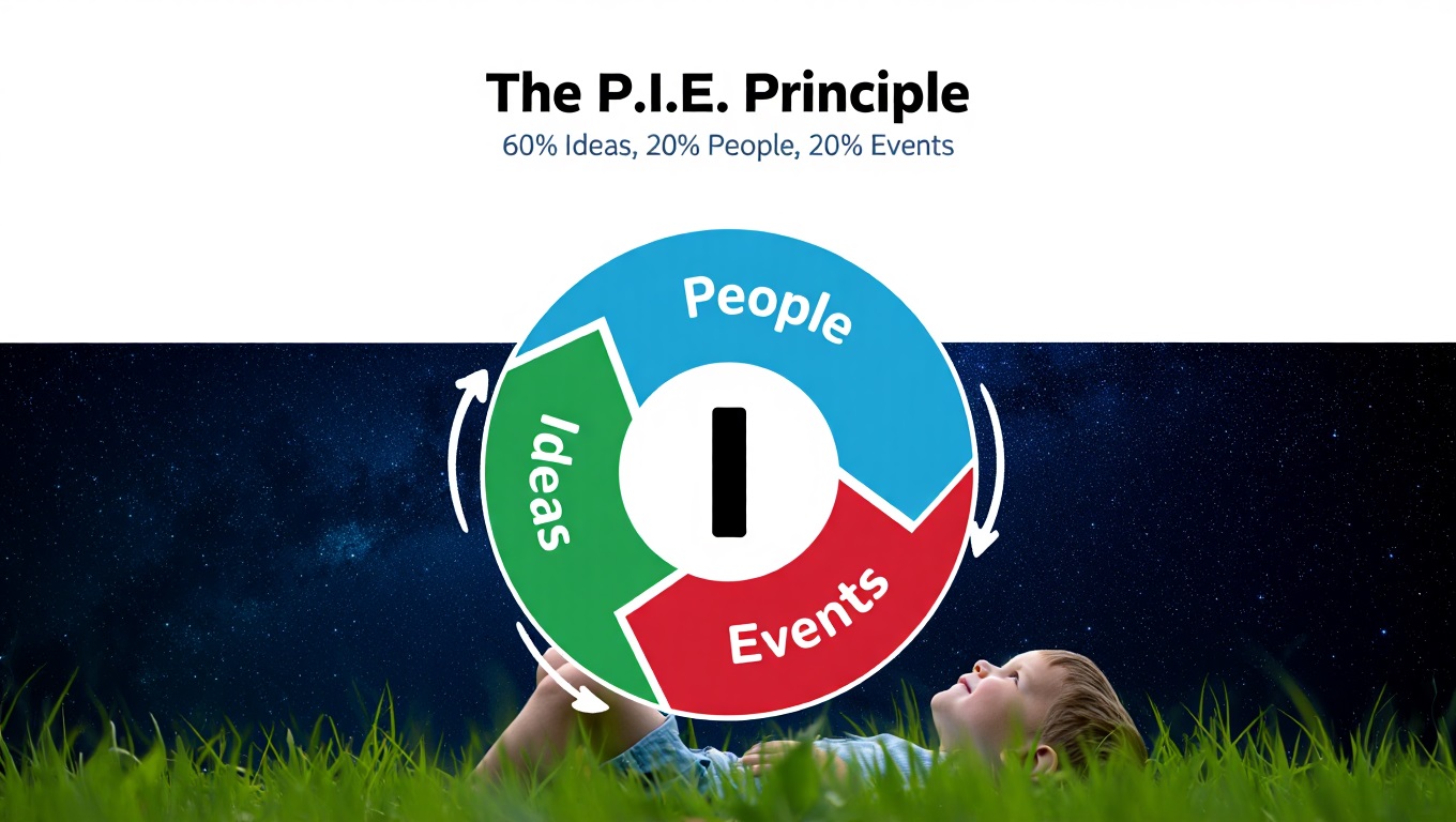 I posit that the P.I.E. (People, Ideas, Events) principle allows me to focus on ideas 60% of the time, 20% on people, and 20% on events, because all of these are connected through the “I” factor. In this context, “I” stands for ideas of the personal “I”. With “I” as the center, I believe that the circle of connection with people and events can become more fine-tuned for how we handle them. Once this is experienced, we will realize that there is a greater force that orchestrates everything.